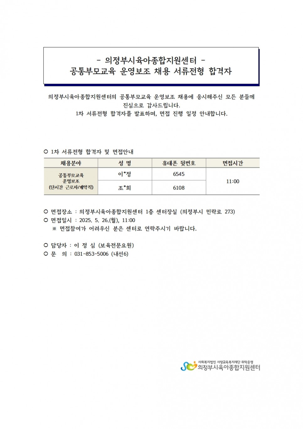 ★ 공통부모교육 운영보조 1차 서류 합격자 발표 페이지 정보 작성자 의정부센터 댓글 0건 조회 356회 작성일 2025-05-23 14:10 본문 ★ 공통부모교육 운영보조 1차 서류 합격자 발표 목록 이전글★ 의정부시육아종합지원센터 공통부모교육 운영보조 최종 합격자발표 (단시간근로자) 25.05.27 다음글[모두의 놀이터] 7월 놀이실 신청 안내 25.05.22