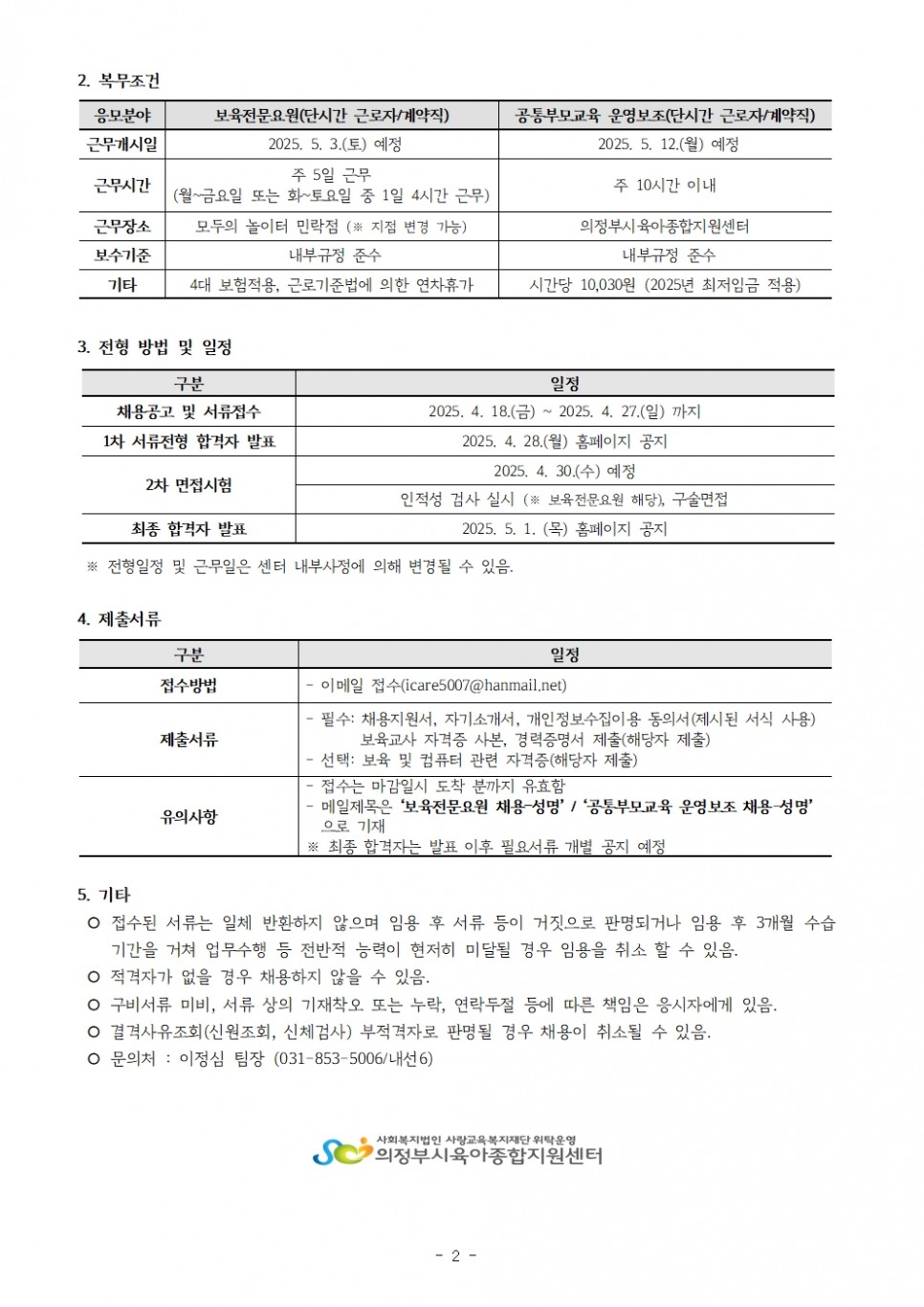 ★ [채용] 의정부시육아종합지원센터 신규직원(보육전문요원, 공통부모교육 운영보조) 채용 공고