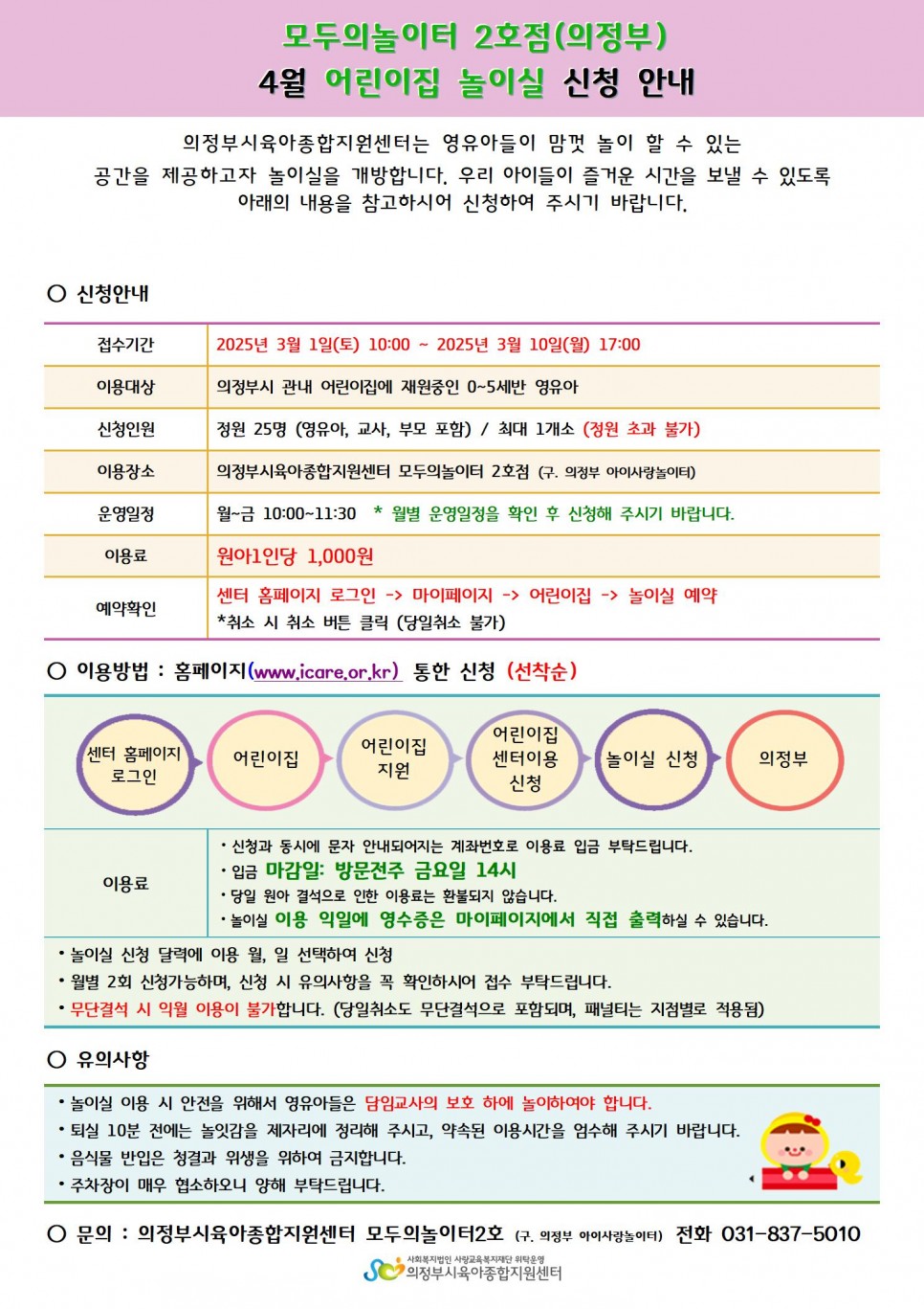 ⦁ 놀이실 이용 시 안전을 위해서 영유아들은 담임교사의 보호 하에 놀이하여야 합니다.