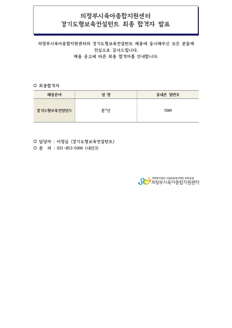 [채용]의정부시육아종합지원센터 경기도형보육컨설턴트 최종 합격자 발표 페이지 정보 작성자 의정부센터 댓글 0건 조회 1,111회 작성일 2024-08-21 09:05 본문 [채용]의정부시육아종합지원센터 경기도형보육컨설턴트 최종 합격자 발표 목록 이전글[의정부, 민락] 2024년 10월 놀이실 신청안내 24.08.22 다음글[중앙육아종합지원센터] 2024년 유아·청소년 흡연예방 공모전 24.08.16