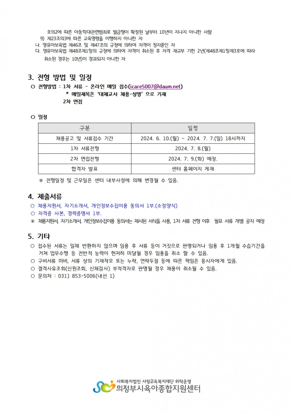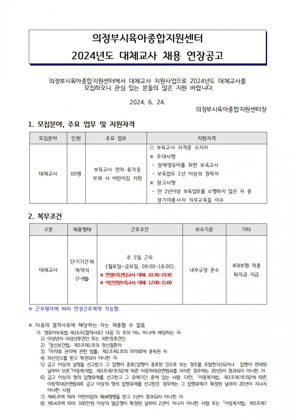 [의정부시육아종합지원센터] 2024년 월급형 대체교사 채용 연장공고 페이지 정보 작성자 의정부센터 댓글 0건 조회 1,762회 작성일 2024-06-24 16:26 첨부파일 채용관련서식공통 1.hwp (94.5K) 41회 다운로드 | DATE : 2024-06-24 16:26:38 본문 [의정부시육아종합지원센터] 2024년 월급형 대체교사 채용 연장공고 목록 이전글[채용] 의정부시육아종합지원센터 채용 서류전형 합격자발표 (대체교사) 24.07.08 다음글[의정부, 민락] 2024년 8월 놀이실 신청안내 24.06.21