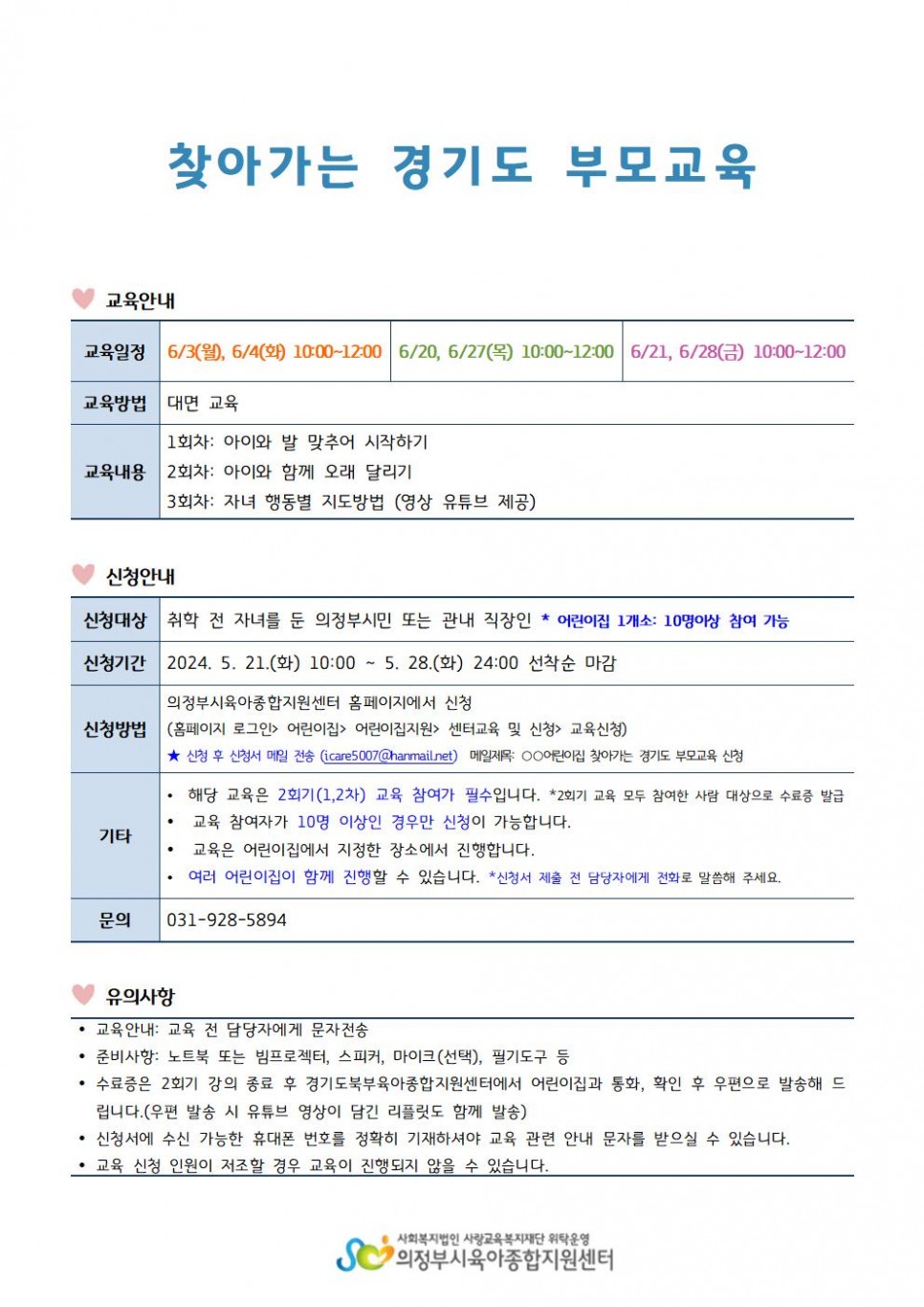 [부모교육] 6월 찾아가는 경기도 부모교육 신청 안내 페이지 정보 작성자 의정부센터 댓글 0건 조회 1,069회 작성일 2024-05-16 17:16 본문 해당 교육은 2회기 교육으로 진행되며, 1회기 교육 신청 시 2회기 교육은 자동신청 됩니다. 안내문을 꼼꼼히 확인하신 후 신청 부탁드립니다. 목록 이전글[의정부, 민락] 2024년 7월 놀이실 신청안내 24.05.17 다음글[삼성복지재단] 2024 함께 성장하는 보육인을 위한 원장특강 첫번째 이야기 24.05.16