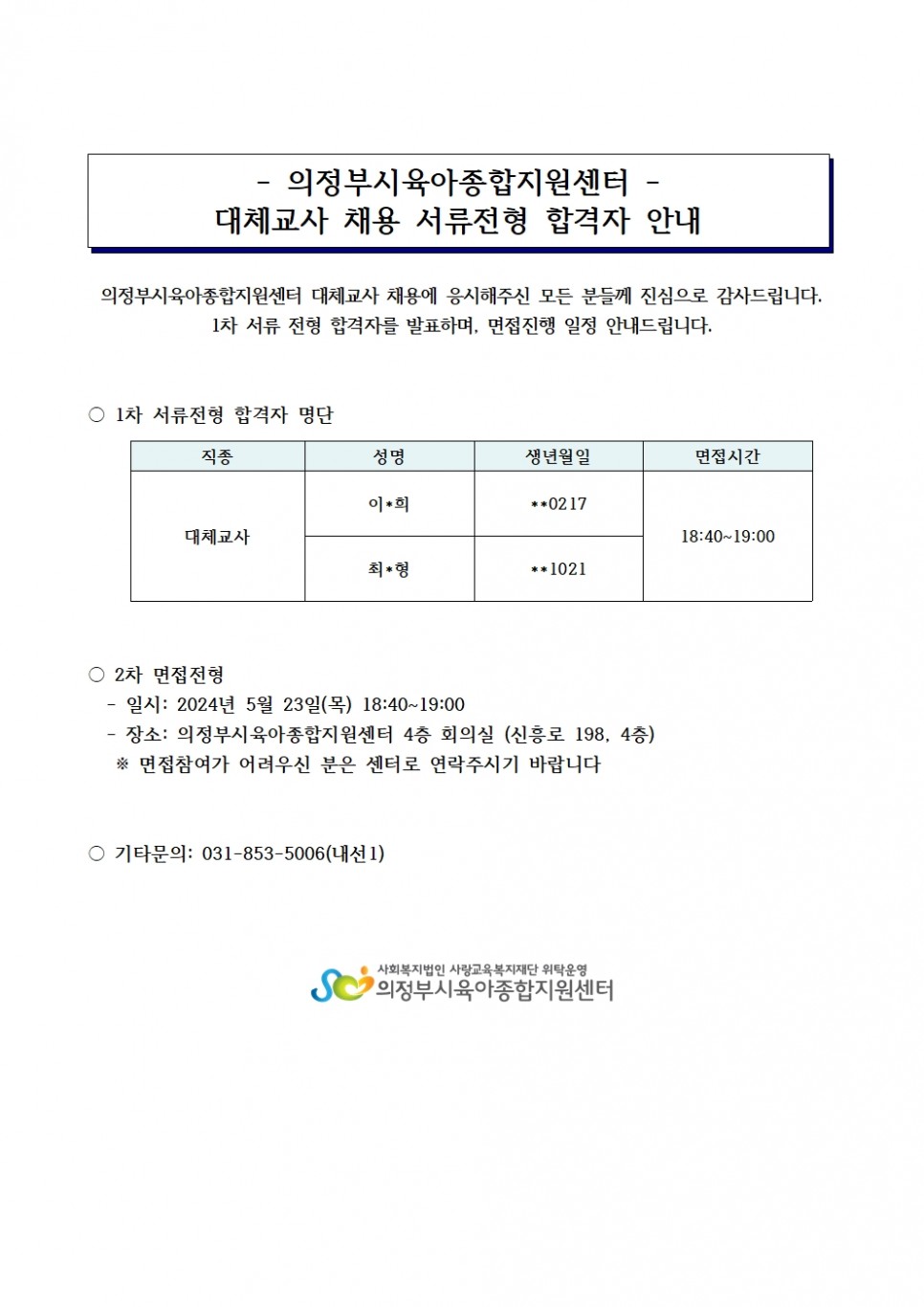 - 다음글[채용] 운영요원 1차 서류전형 합격자 발표 및 면접일시 안내 24.05.20