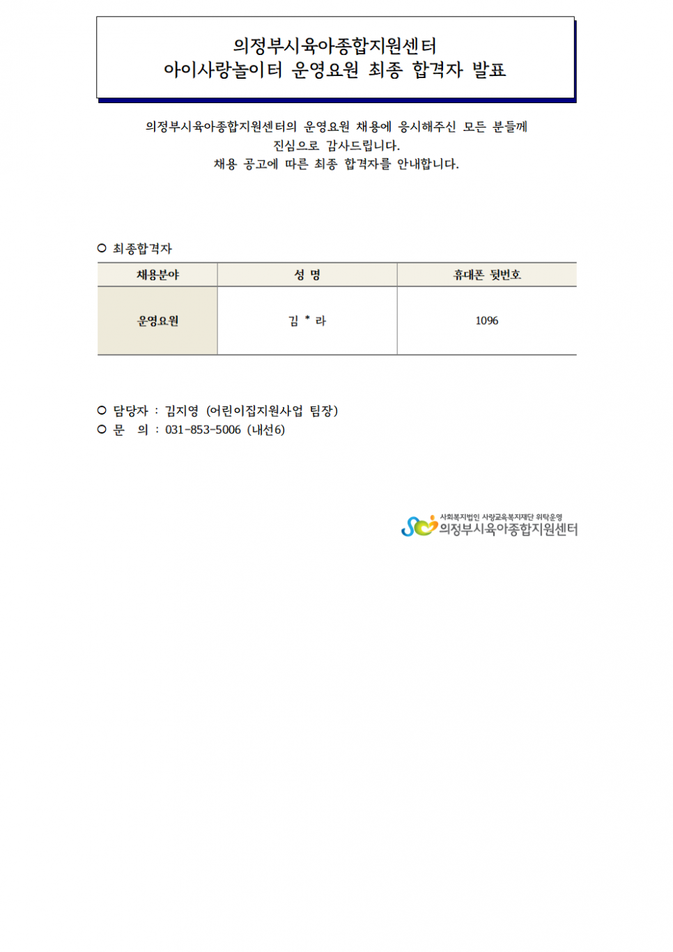 [채용]아이사랑놀이터 운영요원 최종합격자 발표