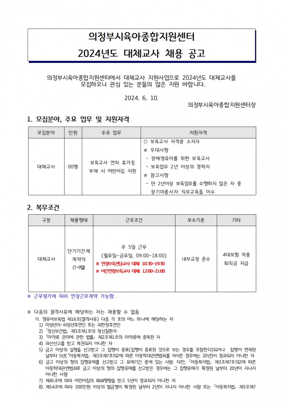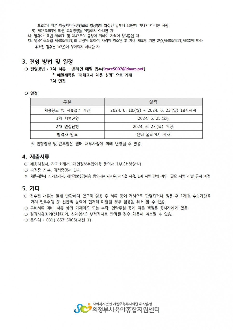 [의정부시육아종합지원센터] 2024년 월급형 대체교사 채용 공고 페이지 정보 작성자 의정부센터 댓글 0건 조회 2,083회 작성일 2024-06-10 17:01 첨부파일 채용관련서식공통 1.hwp (94.5K) 24회 다운로드 | DATE : 2024-06-10 17:01:19 본문 [의정부시육아종합지원센터] 2024년 월급형 대체교사 채용 공고 목록 이전글경기도 국공립어린이집연합회 직원 채용 공고 24.06.11 다음글[채용]아이사랑놀이터 운영보조 1차 서류전형 합격자 발표 22.02.07
