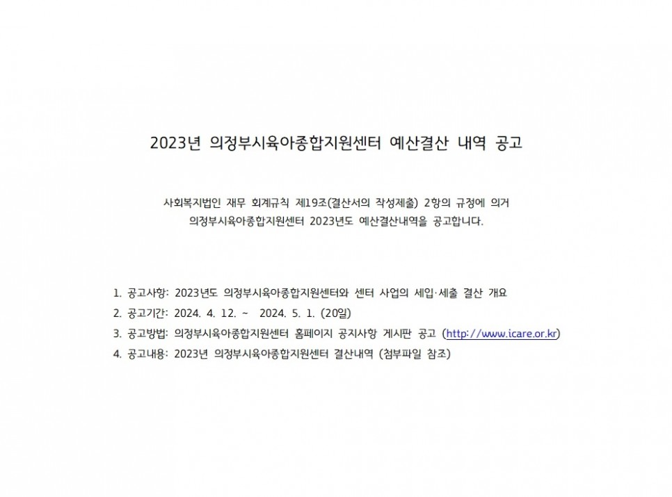 2023년 의정부시육아종합지원센터 예산결산 내역 공고 > 공지사항