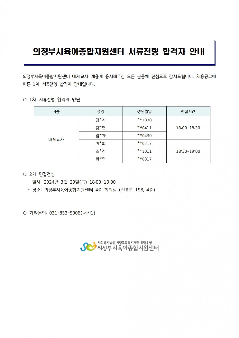 [채용] 의정부시육아종합지원센터 채용 서류전형 합격자발표 (대체교사) 페이지 정보 작성자 의정부센터 댓글 0건 조회 1,352회 작성일 2024-03-26 11:13 본문 [채용] 의정부시육아종합지원센터 채용 서류전형 합격자발표 (대체교사) 목록 이전글[의정부, 민락] 2024년 5월 놀이실 신청안내 24.03.27 다음글의정부시육아종합지원센터 공통부모교육 운영보조 채용 서류전형 합격자 발표 24.03.25