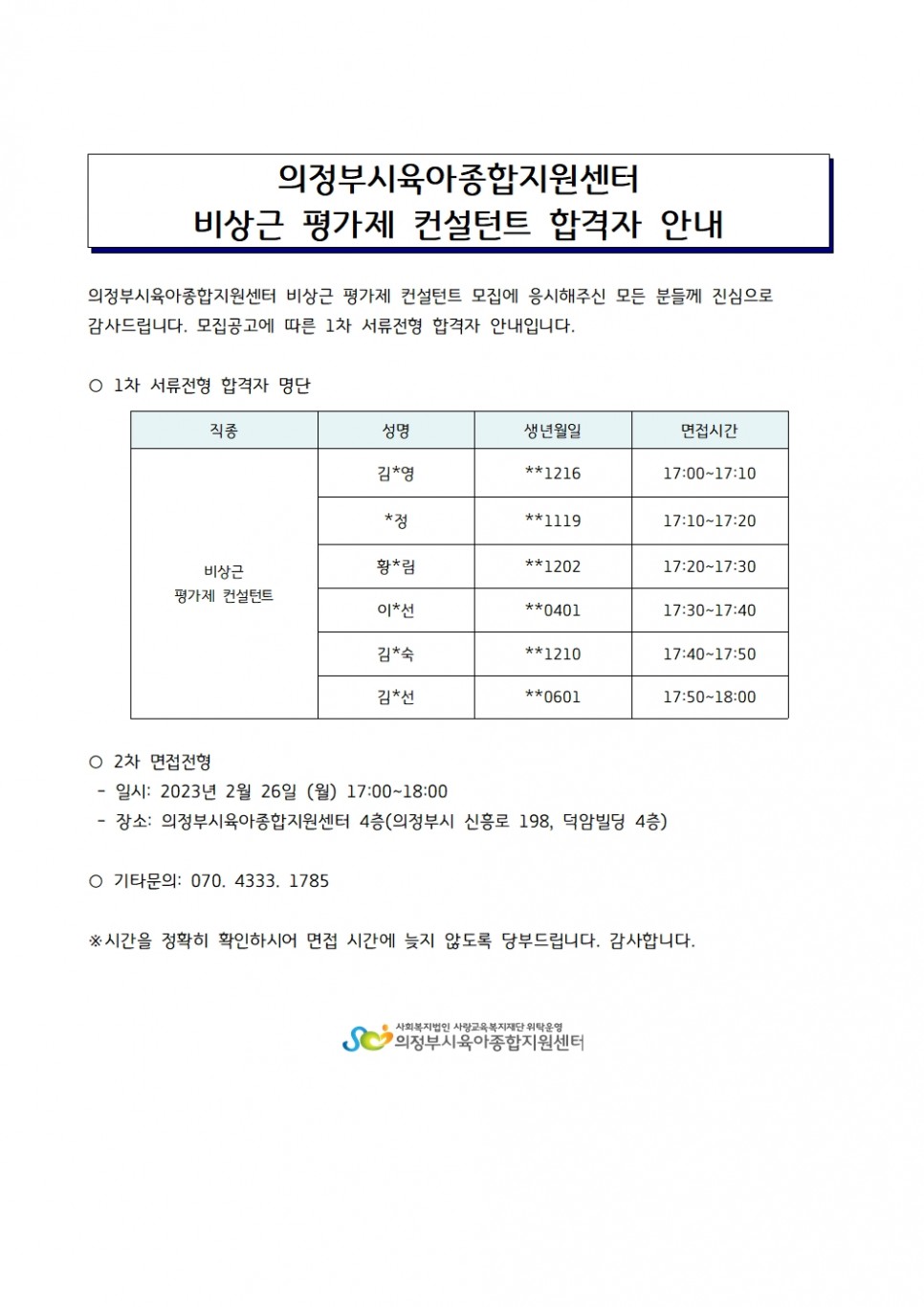 의정부시육아종합지원센터 비상근 평가제 컨설턴트 서류전형 합격자발표 페이지 정보 작성자 의정부센터 댓글 0건 조회 1,620회 작성일 2024-02-20 14:11 본문 의정부시육아종합지원센터 비상근 평가제 컨설턴트 서류전형 합격자발표 목록 이전글[의정부, 민락] 2024년 4월 놀이실 신청안내 24.02.22 다음글어린이집지원사업 뉴스레터 (2024-03호) 24.02.19