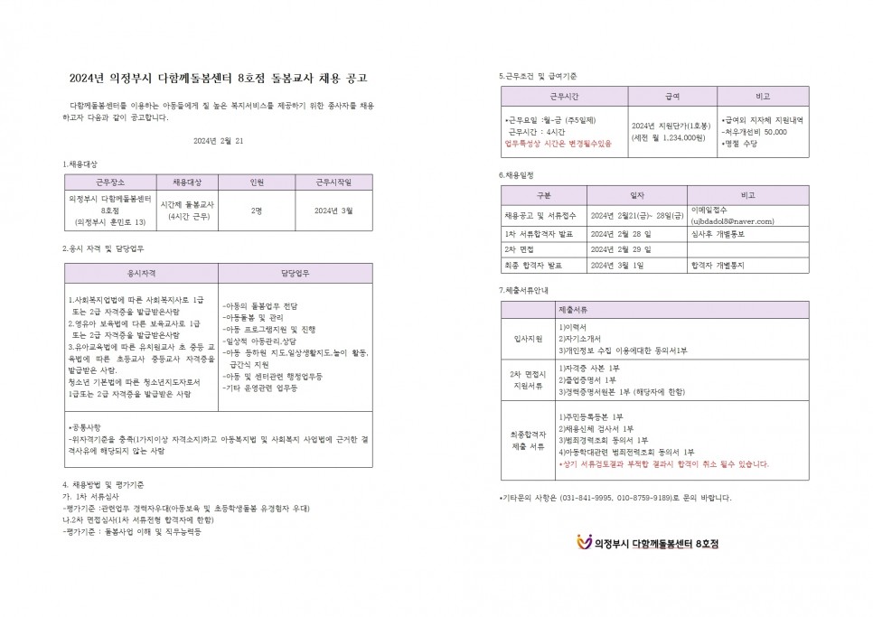 2024년 의정부시 다함께돌봄센터 8호점 돌봄교사 채용 공고