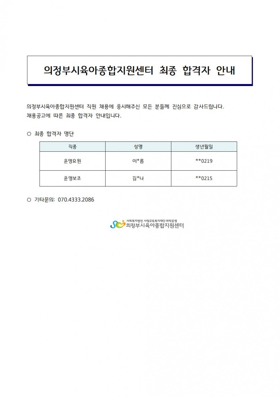 의정부시육아종합지원센터 직원 채용 최종 합격자발표 (운영요원, 운영보조)