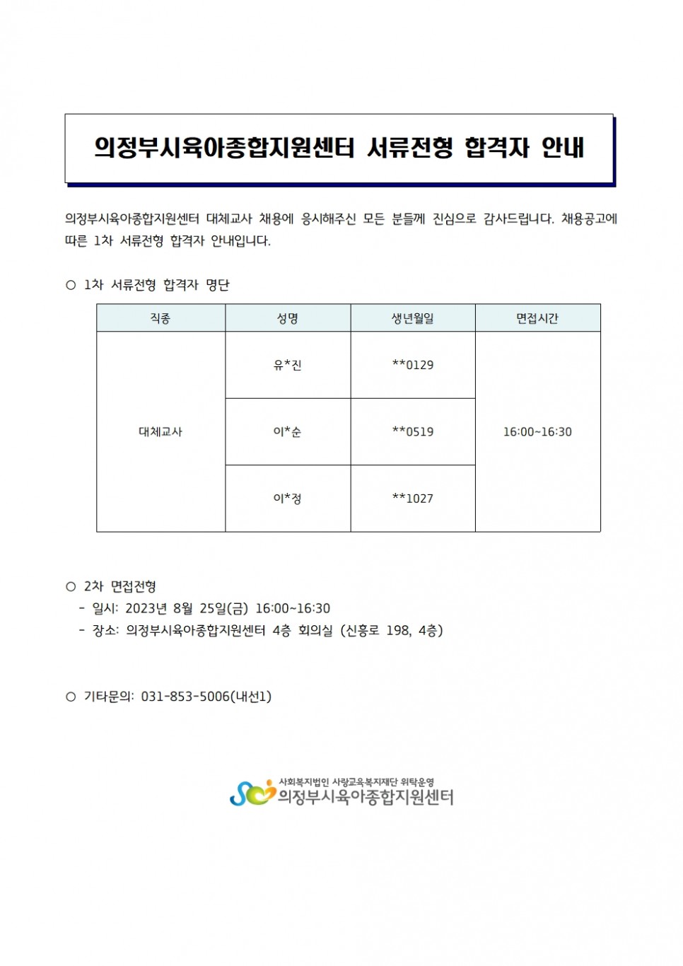 [채용] 의정부시육아종합지원센터 채용 서류전형 합격자발표 (대체교사)