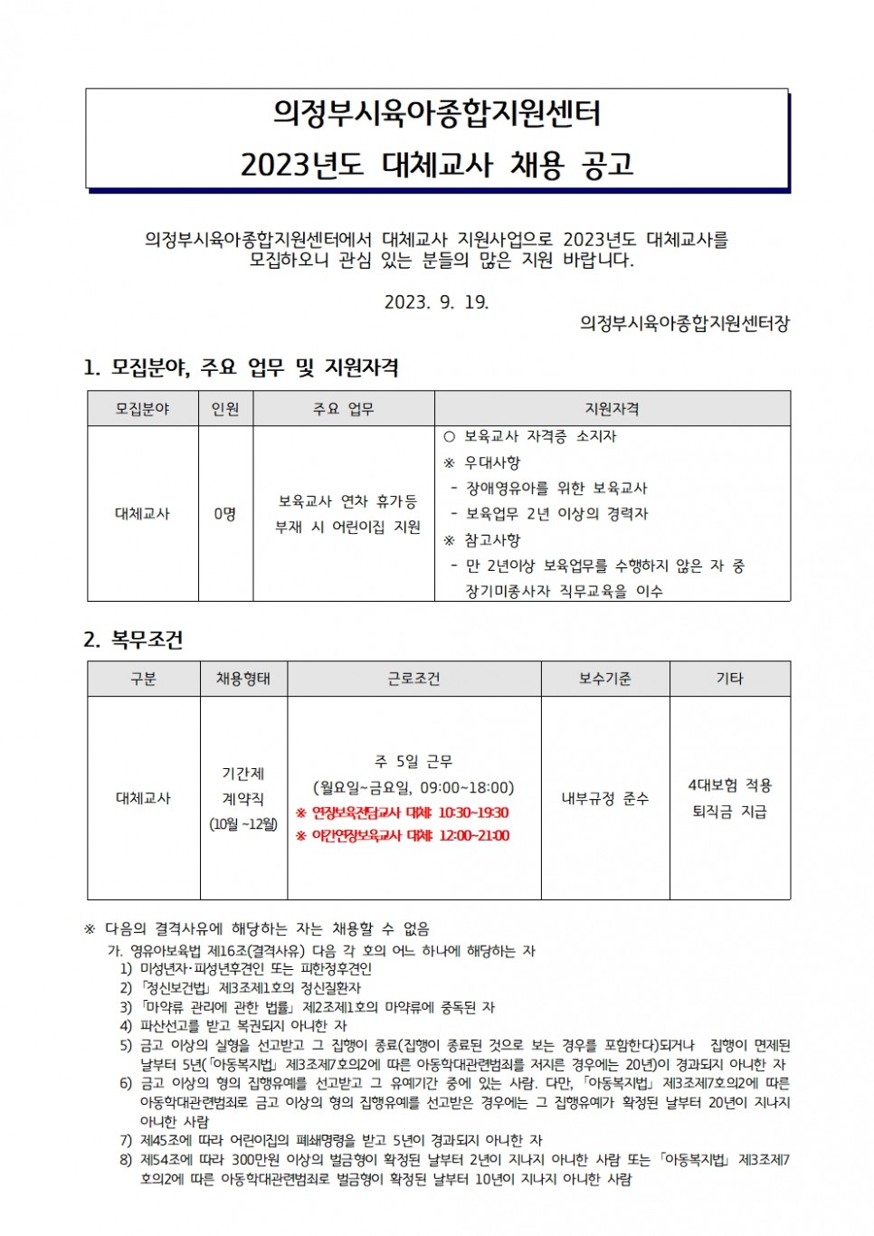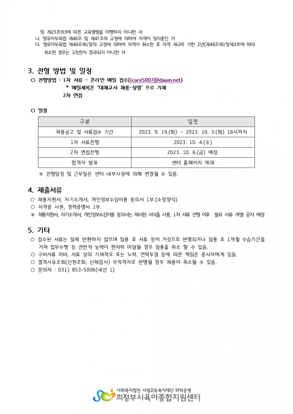 [채용] 의정부시육아종합지원센터 대체교사 채용 공고 페이지 정보 작성자 의정부센터 댓글 0건 조회 1,849회 작성일 2023-09-19 16:39 첨부파일 첨부 채용지원서, 자기소개서, 개인정보수집이용동의서.hwp (48.0K) 26회 다운로드 | DATE : 2023-09-19 16:39:43 본문 [채용] 의정부시육아종합지원센터 대체교사 채용 공고 목록 이전글2023년 10월 부모교육 안내 23.09.21 다음글2023년 우수보육프로그램 공모전 [제6회 우리 어린이집이 최고!] 수상작 안내 23.09.15