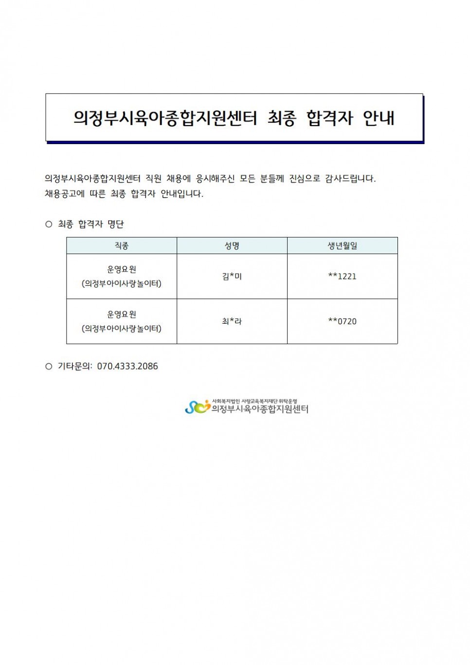 [채용]의정부시육아종합지원센터 직원 채용(운영요원) 최종 합격자 발표 페이지 정보 작성자 의정부센터 댓글 0건 조회 1,583회 작성일 2023-07-20 09:43 본문 [채용]의정부시육아종합지원센터 직원 채용(운영요원) 최종 합격자 발표 목록 이전글[채용] 공통부모교육 운영보조 채용 공고 23.07.20 다음글[채용] 의정부시육아종합지원센터 채용 1차 서류전형 합격자발표 (운영요원) 23.07.17