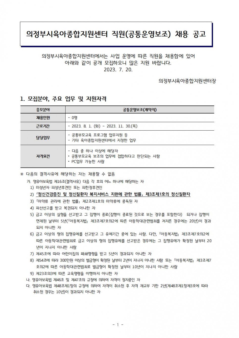 - 다음글[채용]의정부시육아종합지원센터 직원 채용(운영요원) 최종 합격자 발표 23.07.20
