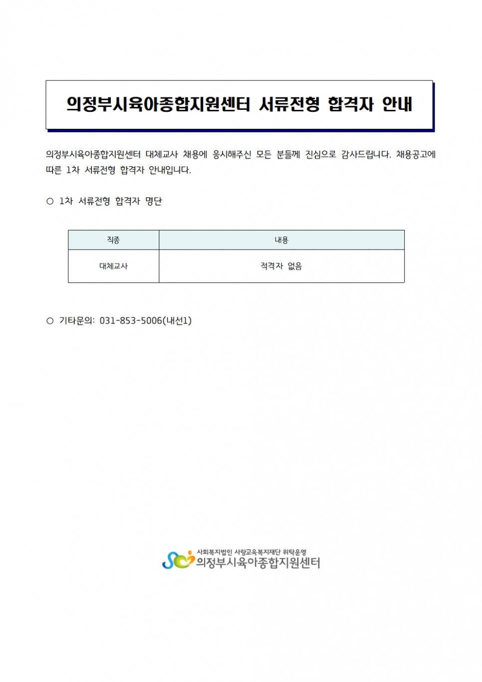 [채용] 의정부시육아종합지원센터 채용 서류전형 합격자발표 (대체교사) 페이지 정보 작성자 의정부센터 댓글 0건 조회 1,514회 작성일 2023-07-24 15:41 본문 [채용] 의정부시육아종합지원센터 채용 서류전형 합격자발표 (대체교사) 목록 이전글[채용] 의정부시육아종합지원센터 채용 1차 서류전형 합격자발표 (공통운영보조) 23.07.27 다음글[채용] 공통부모교육 운영보조 채용 공고 23.07.20