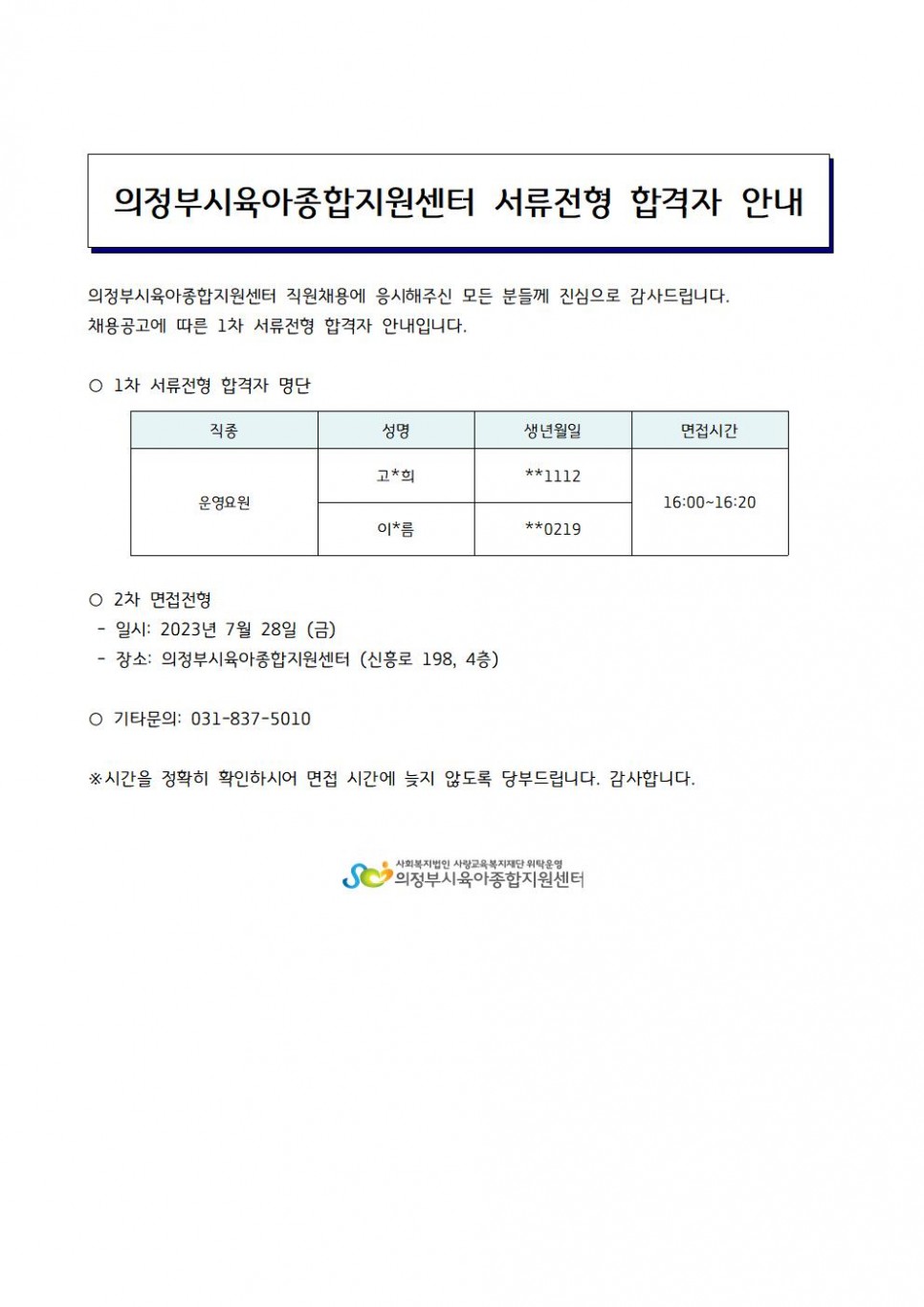 [채용] 의정부시육아종합지원센터 채용 1차 서류전형 합격자발표 (공통운영보조) 페이지 정보 작성자 의정부센터 댓글 0건 조회 1,460회 작성일 2023-07-27 20:10 본문 [채용] 의정부시육아종합지원센터 채용 1차 서류전형 합격자발표 (공통운영보조) 목록 이전글[보건복지부[ 「2023년 맞돌봄 사진·영상 공모전」 안내 23.07.28 다음글[채용] 의정부시육아종합지원센터 채용 서류전형 합격자발표 (대체교사) 23.07.24
