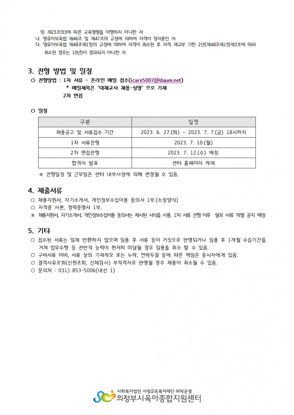 [채용] 의정부시육아종합지원센터 대체교사 채용 공고 페이지 정보 작성자 의정부센터 댓글 0건 조회 1,617회 작성일 2023-06-27 09:57 첨부파일 첨부 채용지원서, 자기소개서, 개인정보수집이용동의서.hwp (51.0K) 20회 다운로드 | DATE : 2023-06-27 09:57:38 본문 [채용] 의정부시육아종합지원센터 대체교사 채용 공고 목록 이전글[채용]의정부시육아종합지원센터 직원(운영요원) 추가 채용 공고 23.06.29 다음글[채용]의정부시육아종합지원센터 직원(운영요원) 채용 공고 23.06.23