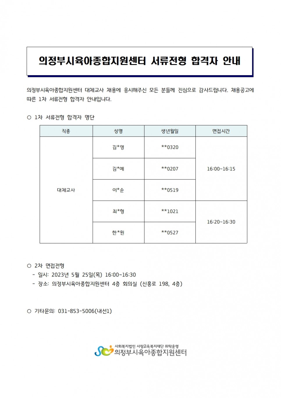 [채용] 의정부시육아종합지원센터 채용 서류전형 합격자발표 (대체교사) 페이지 정보 작성자 의정부센터 댓글 0건 조회 1,700회 작성일 2023-05-19 09:48 본문 [채용] 의정부시육아종합지원센터 채용 서류전형 합격자발표 (대체교사) 목록 이전글2023년 보육교직원 상담 「괜찮아, You」 6월 신청 안내 23.05.19 다음글어린이집지원사업 뉴스레터 (2023-06호) 23.05.19