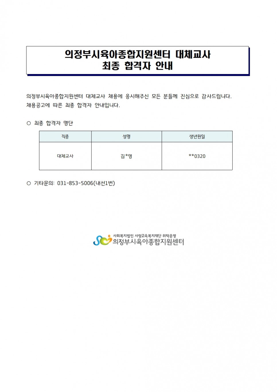 [채용]의정부시육아종합지원센터 직원 채용(대체교사) 최종 합격자 발표 페이지 정보 작성자 의정부센터 댓글 0건 조회 1,739회 작성일 2023-05-26 09:32 본문 [채용]의정부시육아종합지원센터 직원 채용(대체교사) 최종 합격자 발표 목록 이전글[런치특강] 우리아이 이유있는 행동 이해하기 (단체 신청서 첨부) 23.05.26 다음글2023년 육아정보지 여름호 신청 안내 23.05.25