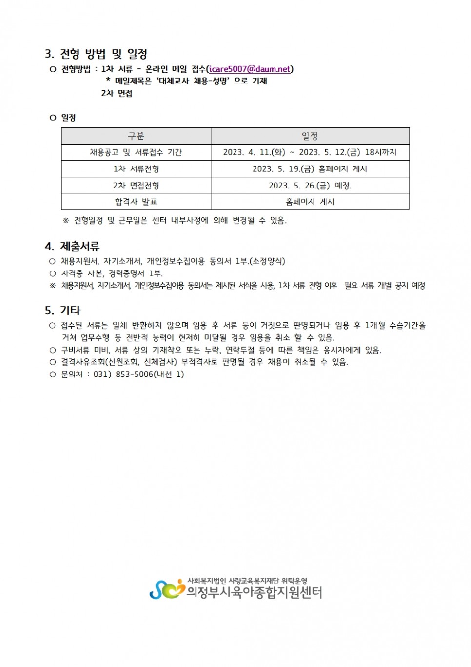 [채용] 의정부시육아종합지원센터 대체교사 채용 연장공고 페이지 정보 작성자 의정부센터 댓글 0건 조회 1,681회 작성일 2023-04-24 16:10 첨부파일 첨부 채용지원서, 자기소개서, 개인정보수집이용동의서.hwp (32.0K) 18회 다운로드 | DATE : 2023-04-24 16:10:29 본문 [채용] 의정부시육아종합지원센터 대체교사 채용 연장공고 목록 이전글[경기도육아종합지원센터] 「보육교직원 고충처리 창구」 사업 및 슬로건 홍보 23.04.26 다음글2023년 열린어린이집 선정기준 (최종) 23.04.24