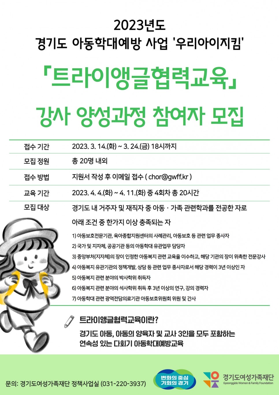 [경기도여성가족재단] 2023년도 경기도 아동학대예방 사업 '우리아이지킴' 「트라이앵글협력교육」 강사 양성과정 참여자모집