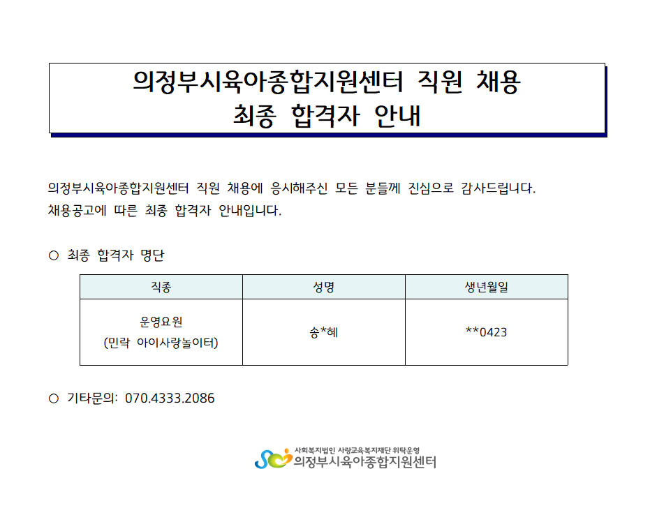 [채용] 의정부시육아종합지원센터 직원 채용(운영요원) 최종 합격자 발표 안내