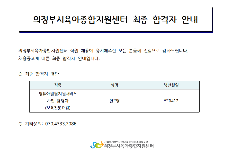 [채용]의정부시육아종합지원센터 직원 채용(영유아발달지원서비스 사업 담당자) 최종 합격자 발표 안내