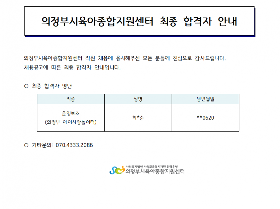 [채용]의정부시육아종합지원센터 직원 채용(운영보조) 최종 합격자 발표 안내