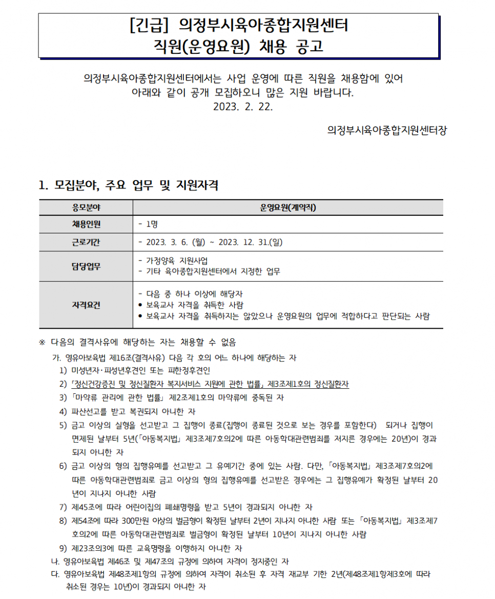 [긴급채용]의정부시육아종합지원센터 직원(의정부아이사랑놀이터 운영요원) 채용 공고