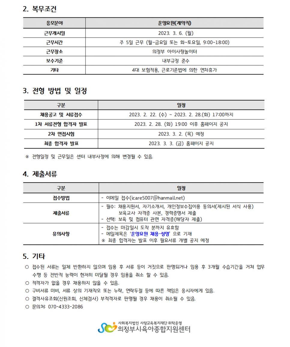 [채용]의정부시육아종합지원센터 직원(의정부아이사랑놀이터 운영요원) 채용 공고