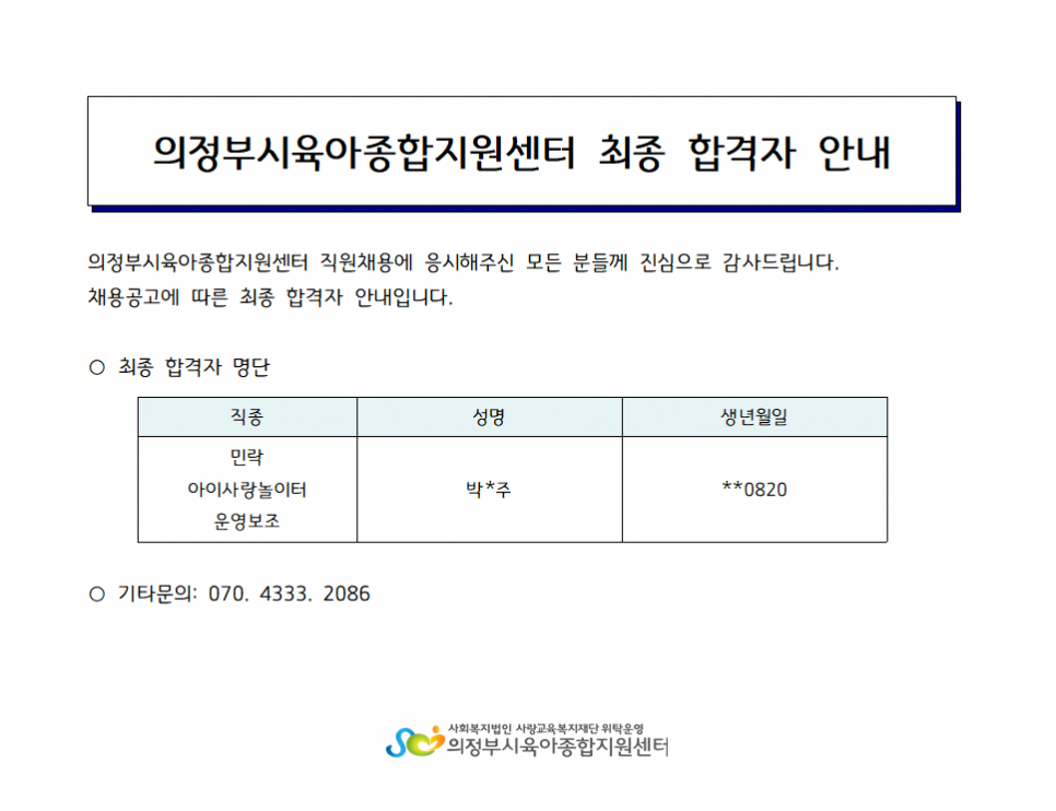 [채용] 의정부시육아종합지원센터 아이사랑놀이터 운영보조 최종 합격자발표 페이지 정보 작성자 의정부센터 댓글 0건 조회 1,777회 작성일 2023-01-19 15:18 본문 [채용] 의정부시육아종합지원센터 아이사랑놀이터 운영보조 최종 합격자발표 목록 이전글2023년 보육교직원 필수의무교육 및 온라인 보수교육 안내 23.01.20 다음글[채용] 의정부시육아종합지원센터 대체교사 채용 공고 23.01.17