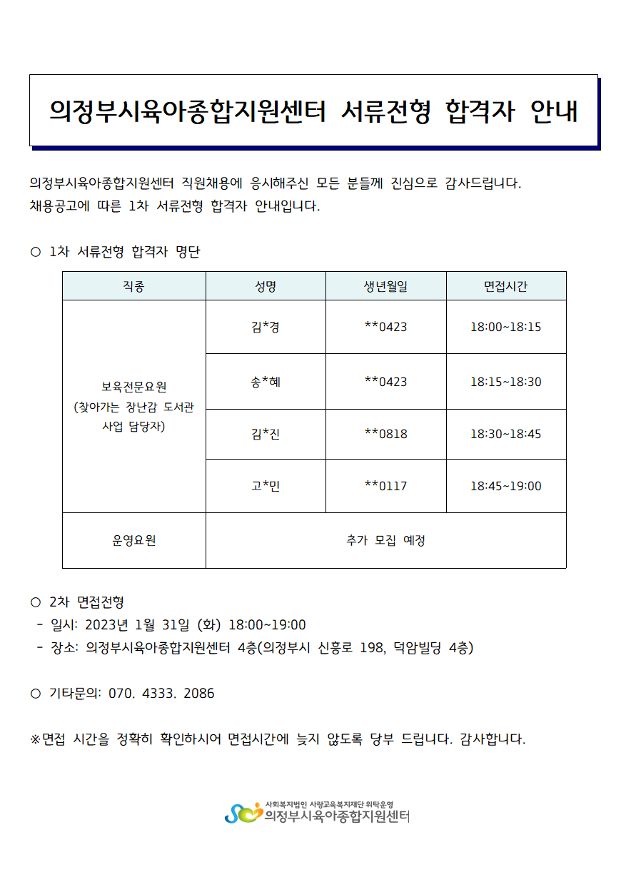 [채용]의정부시육아종합지원센터 직원 채용(보육전문요원, 운영요원) 서류 전형 합격자 발표
