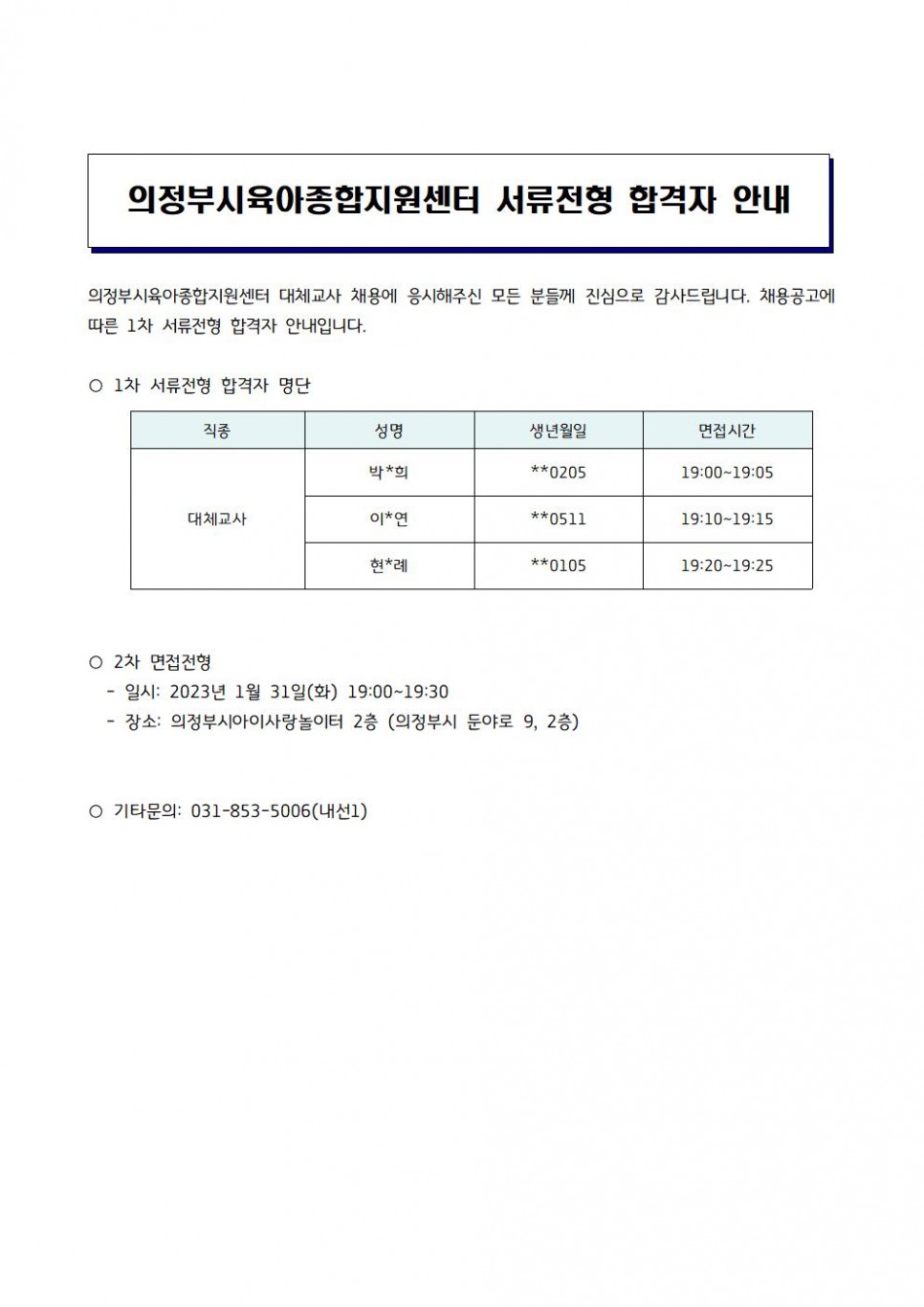 [채용]의정부시육아종합지원센터 직원 채용(대체교사) 서류 전형 합격자 발표