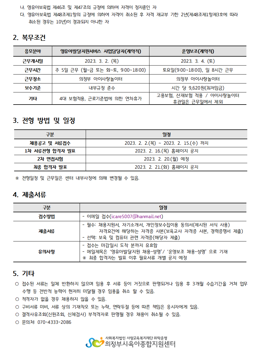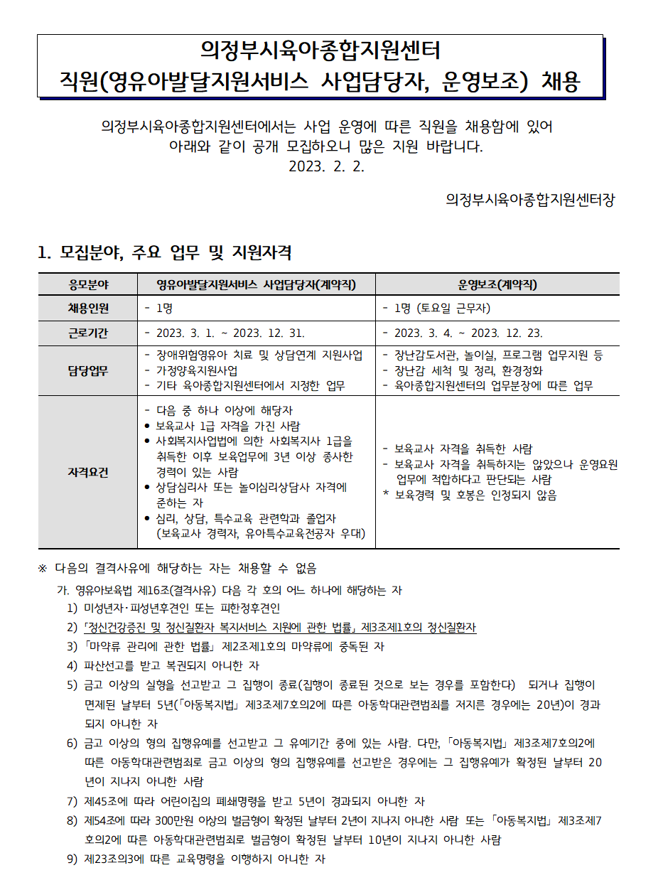 [채용] 의정부시육아종합지원센터 직원(영유아발달지원서비스 담당자, 운영보조) 채용 공고