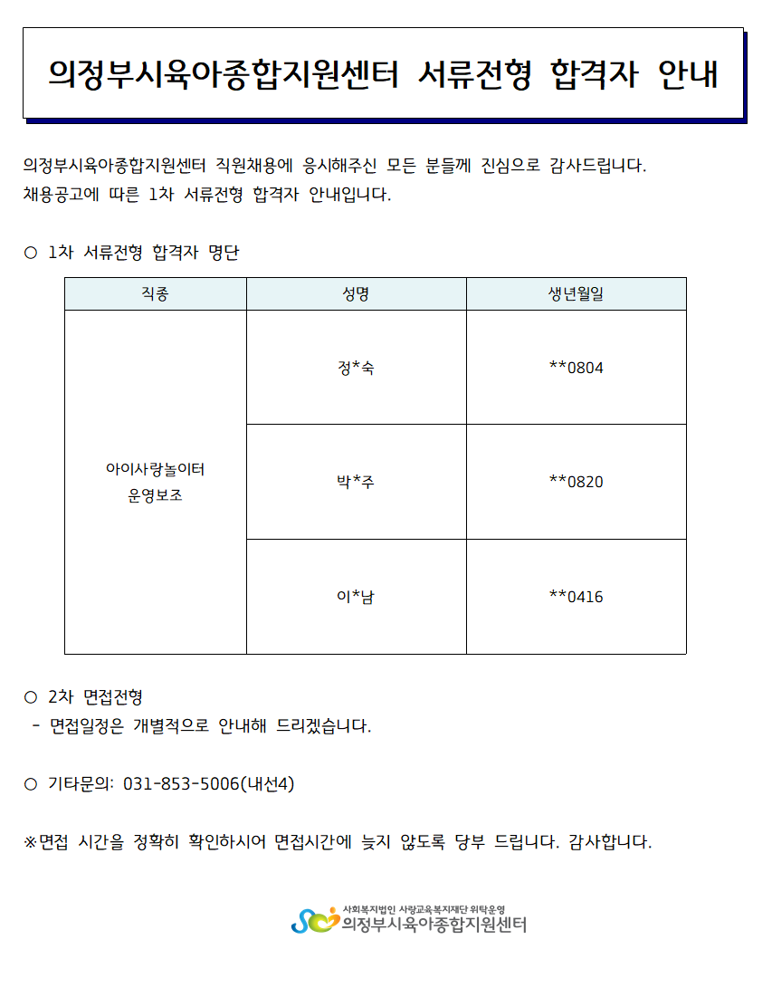 [채용]의정부시육아종합지원센터 아이사랑놀이터 운영보조 채용 서류전형 합격자발표 페이지 정보 작성자 의정부센터 댓글 0건 조회 1,697회 작성일 2022-12-29 10:41 본문 의정부시육아종합지원센터 의정부아이사랑놀이터 서류전형 합격자발표 목록 이전글[채용] 의정부시육아종합지원센터 아이사랑놀이터 운영보조 최종 합격자발표 22.12.30 다음글어린이집지원사업 뉴스레터 (2023-01호) 22.12.28