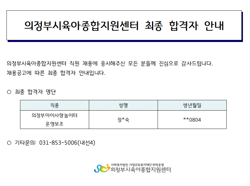 [채용] 의정부시육아종합지원센터 아이사랑놀이터 운영보조 최종 합격자발표 페이지 정보 작성자 의정부센터 댓글 0건 조회 1,710회 작성일 2022-12-30 13:53 본문 [채용] 의정부시육아종합지원센터 아이사랑놀이터 운영보조 최종 합격자발표 목록 이전글2023년 어린이집지원사업 연간 일정 안내 23.01.02 다음글[채용]의정부시육아종합지원센터 아이사랑놀이터 운영보조 채용 서류전형 합격자발표 22.12.29