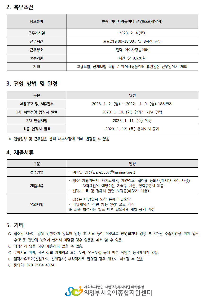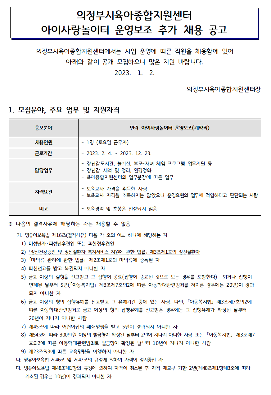 [채용]의정부시육아종합지원센터 아이사랑놀이터 운영보조 추가 채용 공고