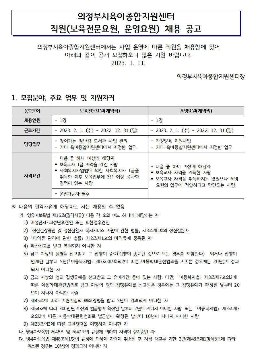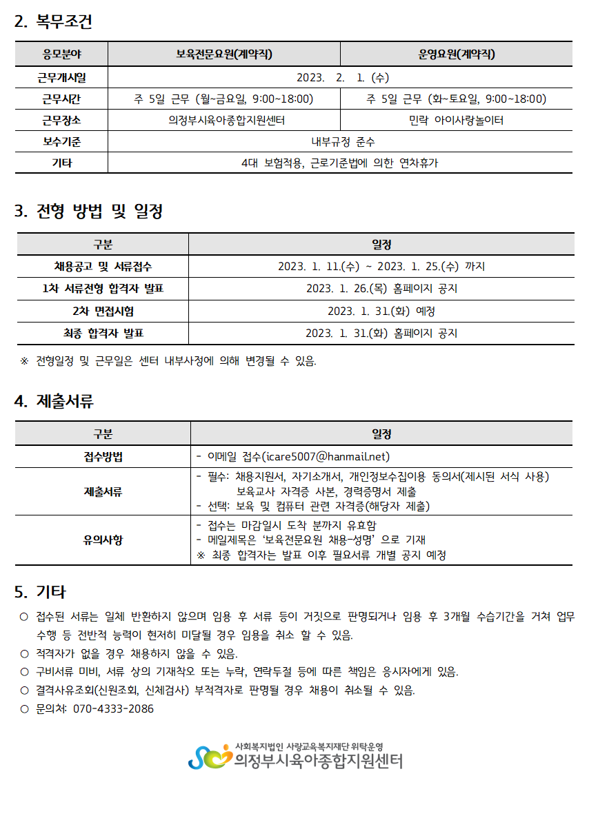 [채용]의정부시육아종합지원센터 직원(보육전문요원, 운영요원) 채용 공고