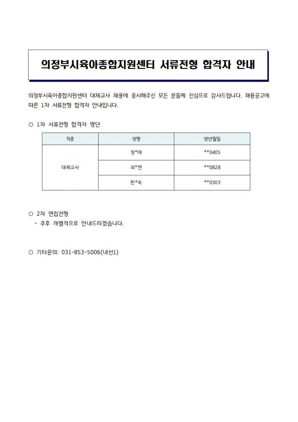 의정부시육아종합지원센터 대체교사 서류전형 합격자발표 페이지 정보 작성자 의정부센터 댓글 0건 조회 1,707회 작성일 2022-10-26 16:34 본문 의정부시육아종합지원센터 대체교사 서류전형 합격자발표 목록 이전글제4차 어린이집 표준보육과정해설서(0~2세 보육과정) 실비보급처 변경 안내 22.10.27 다음글[어린이집안전공제회] 2022년 하반기 안전예방사업 안내 22.10.25
