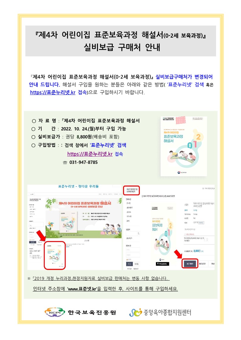 제4차 어린이집 표준보육과정해설서(0~2세 보육과정) 실비보급처 변경 안내 페이지 정보 작성자 의정부센터 댓글 0건 조회 1,605회 작성일 2022-10-27 14:37 본문 * 변경된 해설서 실비보급처를 확인해 주세요. 목록 이전글2022년 열린어린이집 신규 선정 결과 안내 22.11.01 다음글의정부시육아종합지원센터 대체교사 서류전형 합격자발표 22.10.26