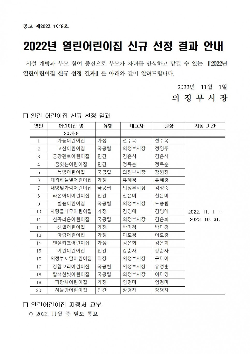 2022년 열린어린이집 신규 선정 결과 안내 > 공지사항