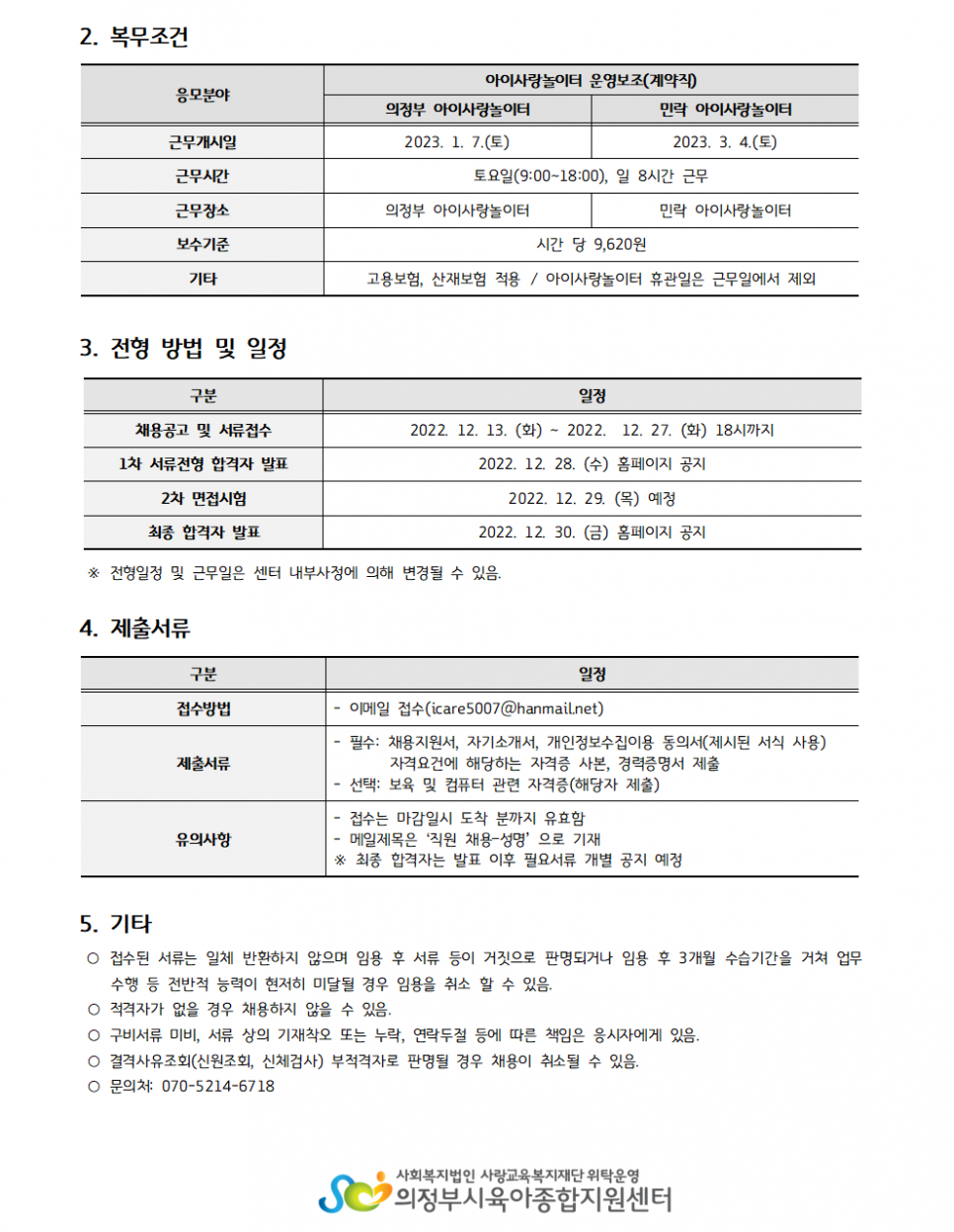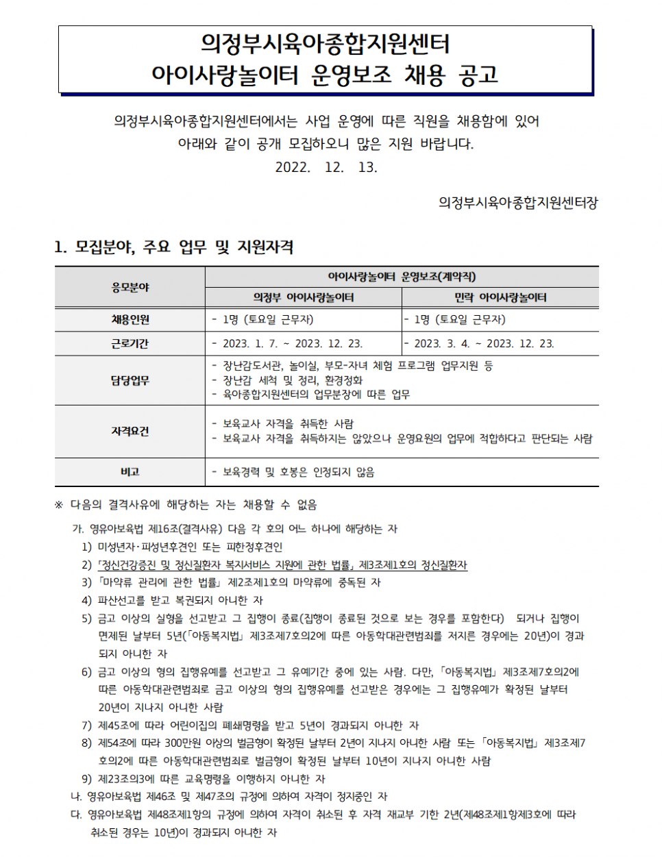 [채용]의정부시육아종합지원센터 아이사랑놀이터 운영보조 채용 공고 페이지 정보 작성자 의정부센터 댓글 0건 조회 2,045회 작성일 2022-12-13 14:58 첨부파일 첨부채용지원서,자기소개서,개인정보수집이용동의서.hwp (50.5K) 26회 다운로드 | DATE : 2022-12-13 14:59:53 본문 [채용]의정부시육아종합지원센터 아이사랑놀이터 운영보조 채용 공고 목록 이전글「어린이집 평가결과 정보공시」 설문조사 22.12.16 다음글[의정부시청]2022년 시민과 함께하는 양성평등 향상교육 온라인 뮤지컬 신청안내 22.12.06