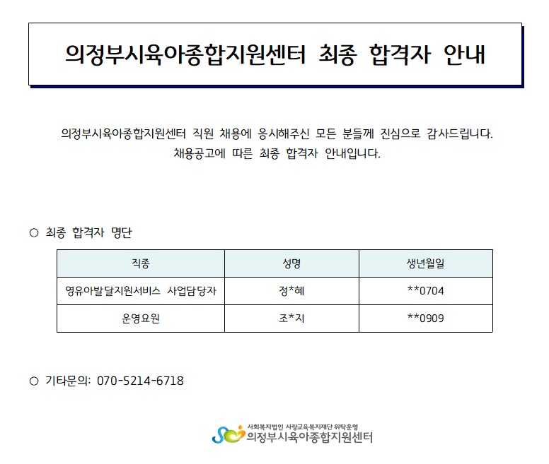 [채용]의정부시육아종합지원센터 직원(영유아발달지원서비스 사업담당자, 운영요원) 채용 최종 합격자 안내 페이지 정보 작성자 의정부센터 댓글 0건 조회 1,746회 작성일 2022-09-21 10:10 본문 의정부시육아종합지원센터 직원(영유아발달지원서비스 사업담당자, 운영요원) 채용 최종 합격자 안내 목록 이전글의정부시육아종합지원센터 대체교사 최종 합격자발표 22.09.21 다음글어린이집지원사업 10월 뉴스레터 (2022-08호) 22.09.19