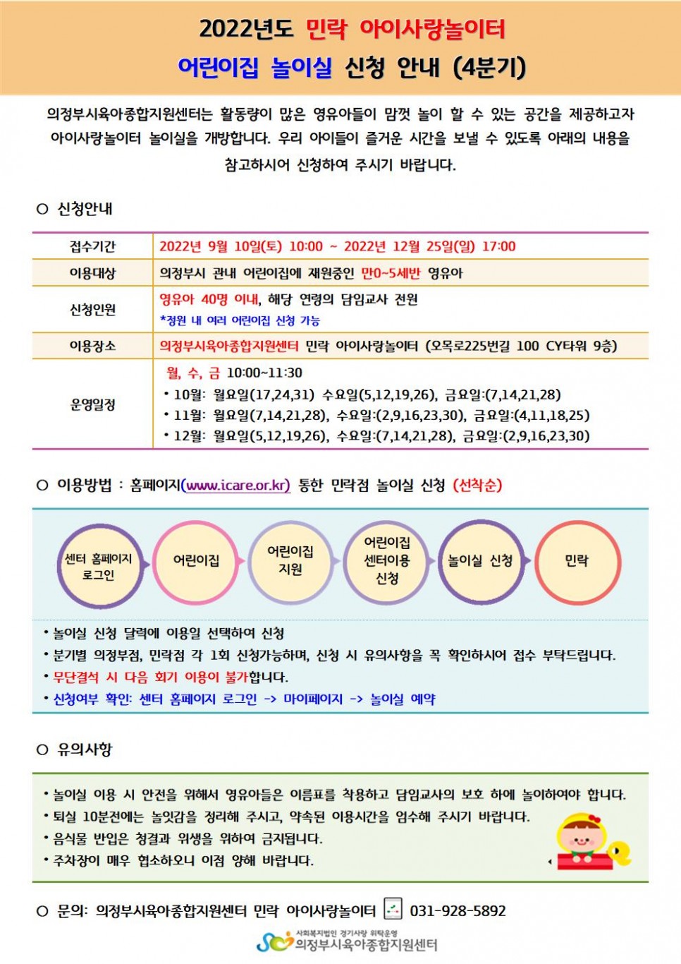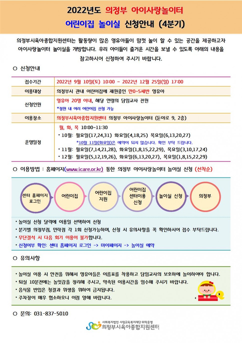 아이사랑놀이터 놀이실 이용 안내(4분기) 페이지 정보 작성자 의정부센터 댓글 0건 조회 1,776회 작성일 2022-08-30 16:37 본문 안내문 꼼꼼히 확인하신 후 신청 부탁드리며, 3분기 신청 후 무단 결석한 어린이집은 이용이 불가하오니 신청 시 유의해 주시기 바랍니다. 목록 이전글제14회 행복한 우리아이 사진 콘테스트 수상작 안내 22.08.31 다음글찾아가는 공통부모교육 10월 (양육스트레스관리 4모듈) 교육 안내 22.08.26