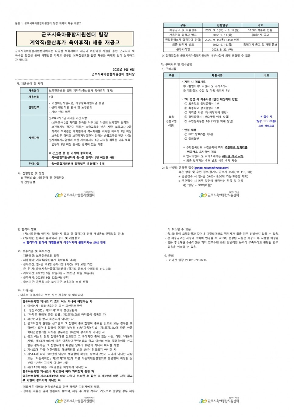 [군포시육아종합지원센터] 팀장 계약직(출산휴가 육아휴직) 채용 재공고 > 공지사항
