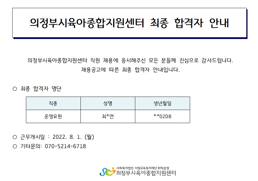 의정부시육아종합지원센터 직원(운영요원) 채용 최종 합격자 안내 페이지 정보 작성자 의정부센터 댓글 0건 조회 1,902회 작성일 2022-07-25 09:54 본문 의정부시육아종합지원센터 직원(운영요원) 채용 최종 합격자 안내 목록 이전글의정부시육아종합지원센터 대체교사 서류전형 합격자발표 22.07.26 다음글의정부시육아종합지원센터 직원(운영요원) 채용 서류전형 합격자 안내 22.07.21