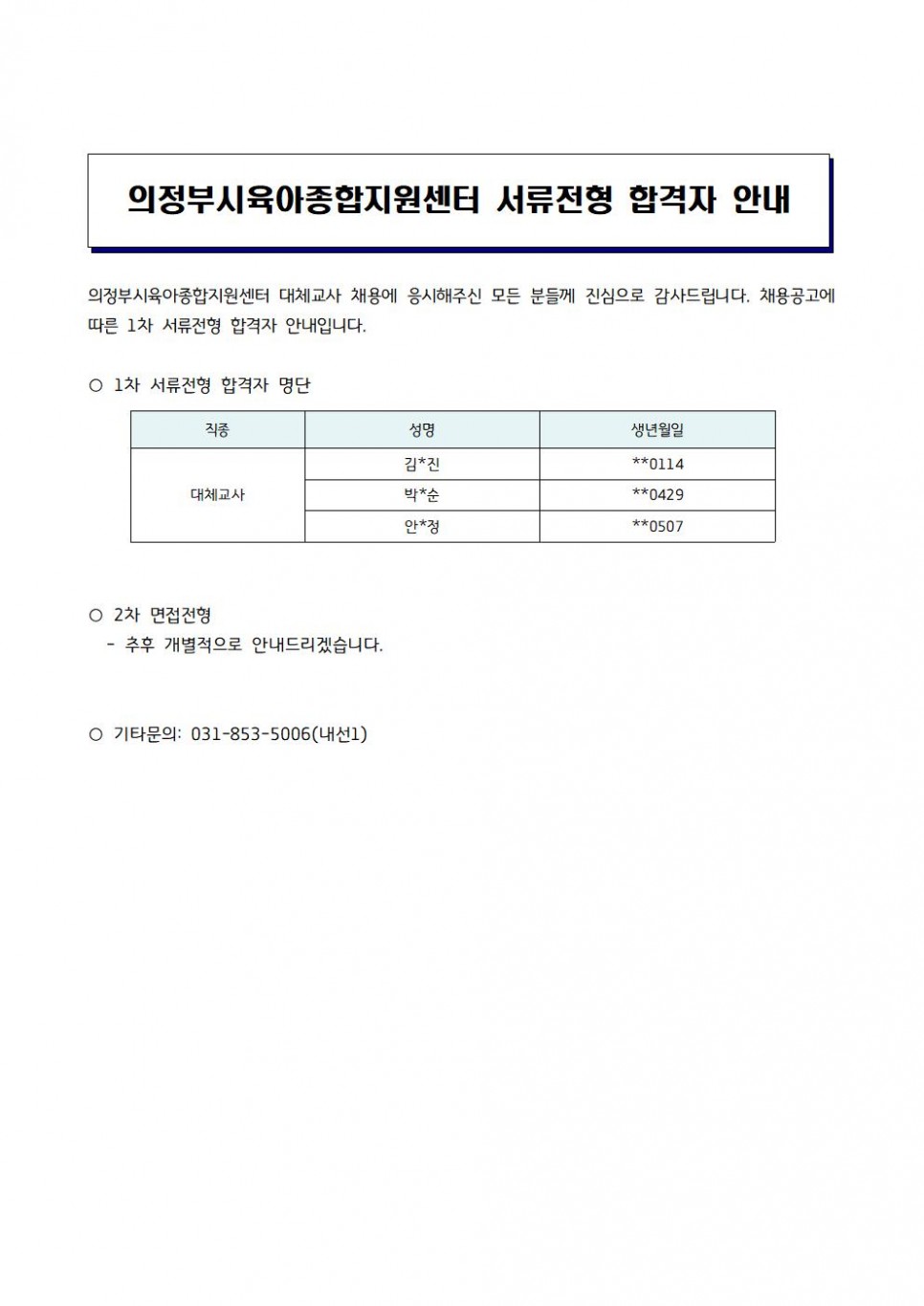 의정부시육아종합지원센터 대체교사 서류전형 합격자발표 페이지 정보 작성자 의정부센터 댓글 0건 조회 1,703회 작성일 2022-07-26 11:06 본문 의정부시육아종합지원센터 대체교사 서류전형 합격자발표 목록 이전글2022 보육사업안내 일부 개정(8.1.시행) 22.07.26 다음글의정부시육아종합지원센터 직원(운영요원) 채용 최종 합격자 안내 22.07.25