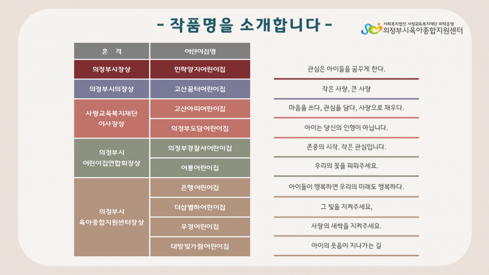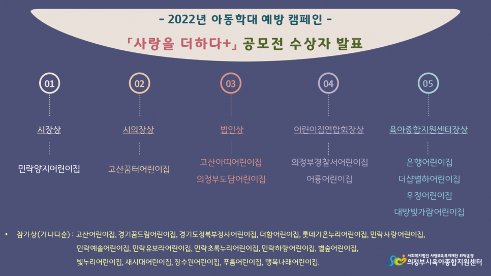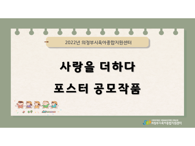 2022년 아동학대 예방 캠페인 '제2회 사랑을 더하다+ 포스터 공모전' 결과발표 페이지 정보 작성자 의정부센터 댓글 0건 조회 2,223회 작성일 2022-08-08 13:53 본문 2022년 아동학대 예방 캠페인 '제2회 사랑을 더하다+ 포스터 공모전' 결과발표 목록 이전글[군포시육아종합지원센터] 군포시육아종합지원센터 팀장 계약직 채용공고 22.08.12 다음글2022년 경기도 공공형어린이집 모집 공고 22.08.05