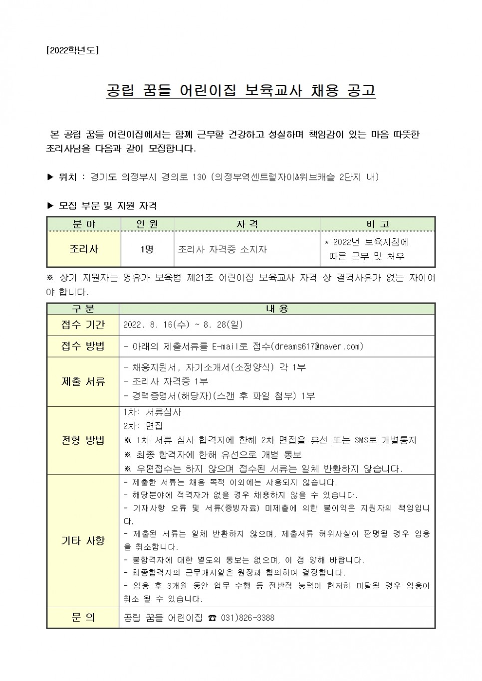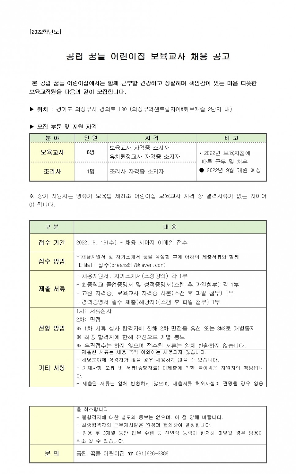 [국공립 꿈들어린이집] 2022년 보육교사, 조리사 채용 공고 > 공지사항