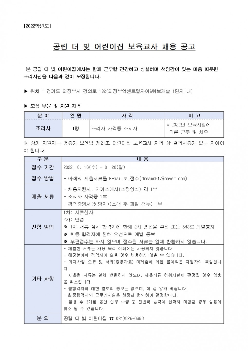 [국공립 더빛어린이집] 2022년 보육교사, 조리사 채용 공고 > 공지사항